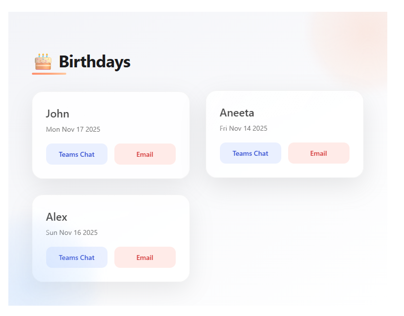 This Birthday web part is a SharePoint Framework (SPFx) component designed to display a list of birthdays from a SharePoint list. It allows users to quickly view upcoming birthdays and interact with colleagues directly from the web part.